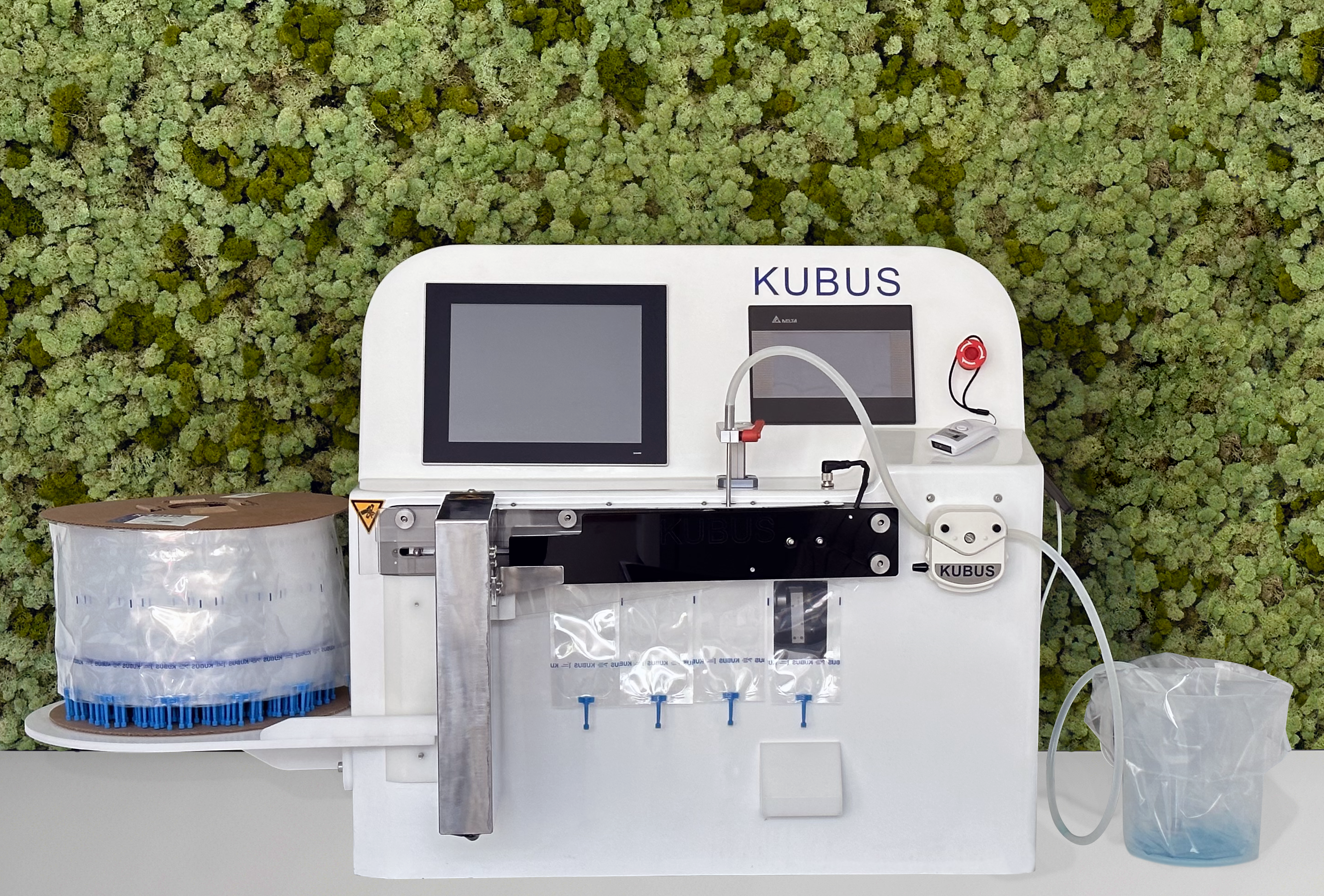 Envasadora de 500 dosis seminales por hora. Fabricada por KUBUS que permite realizar rápidamente el proceso de envasado a falta del etiquetado.
