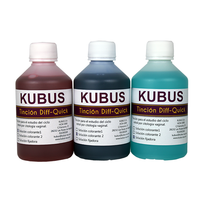 Simple staining method consisting of an eosinophilic, a basophilic and a fixative stain. The staining sequence includes 5-10 immersions in the red stain, then in the navy blue stain, followed by the light blue stain and finally with immersions in water collected from the tap if it has potable properties.