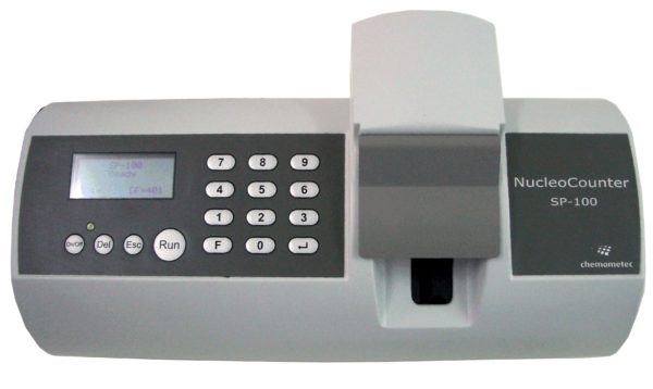 The Nucleocounter system consists of the internal fluorescence microscope, the S100 reagent for sample preparation (membrane lysis) and the SP-1 Cassettes for staining cell nuclei with propidium iodide.